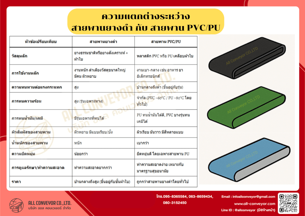 | คุณสมบัติ | สายพานยางดำ | สายพาน PVC/PU |