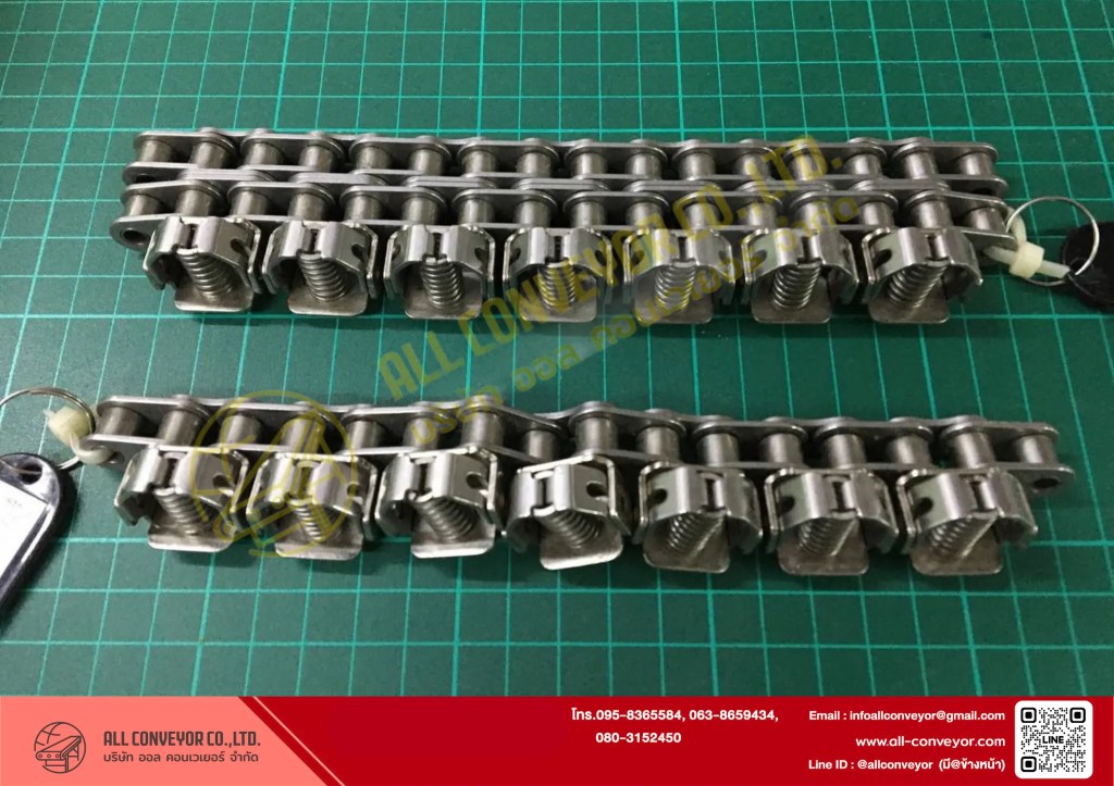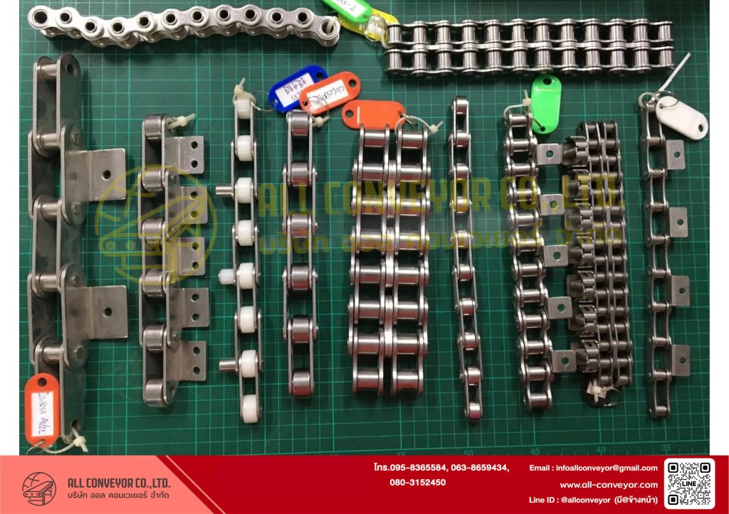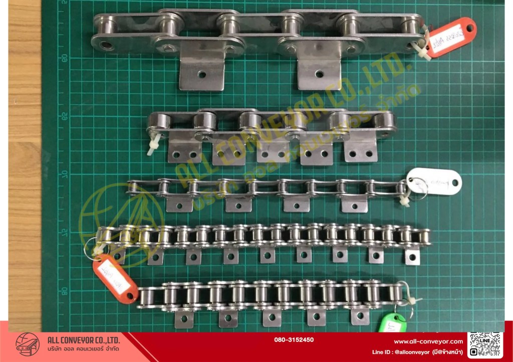 | โซ่แบบพิเศษ (Attachment Chain) | ต้องการให้โซ่ติดอุปกรณ์เสริม | งานคัดแยกสินค้า, สายประกอบ |