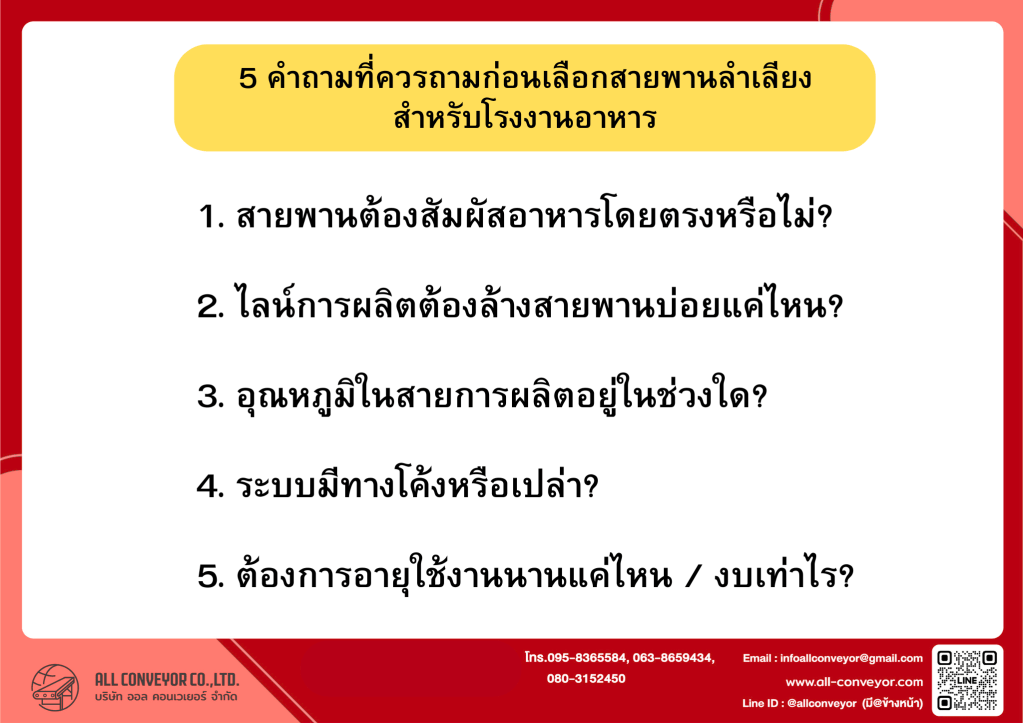 ถามตัวเองให้ครบทั้ง 5 ข้อนี้ เพื่อให้ได้สายพานที่เหมาะกับ สินค้า, ระบบล้าง, และ มาตรฐาน GMP/HACCP