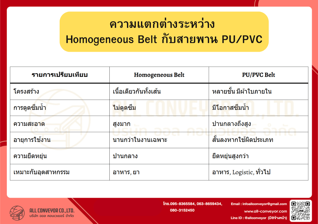 | หัวข้อ | Homogeneous Belt | PU/PVC Belt |