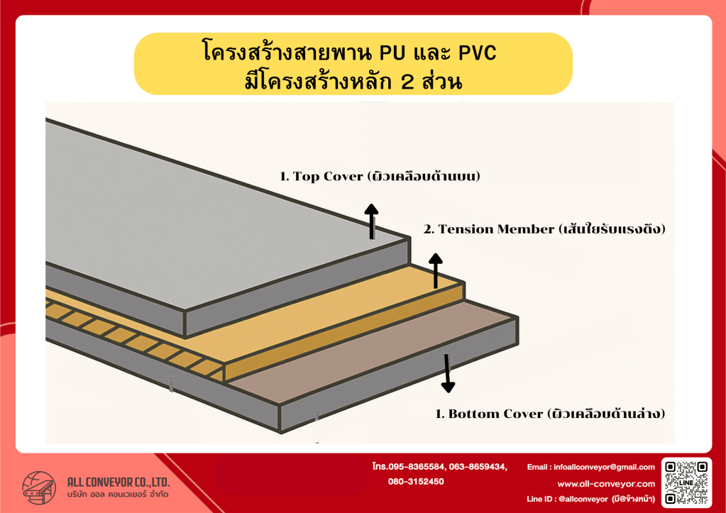 🔧สายพาน PU และ PVC มีโครงสร้างหลัก 2 ส่วน: คือ ส่วนที่เป็นผิวสายพาน (Top and Bottom Cover) ทำหน้าที่ป้องกันส่วนที่เป็นเส้นใยและเป็นสื่อกลางในการลำเลียงวัสดุ และส่วนที่เป็นเส้นใย (Tension Member) ทำหน้าที่รับแรงดึง