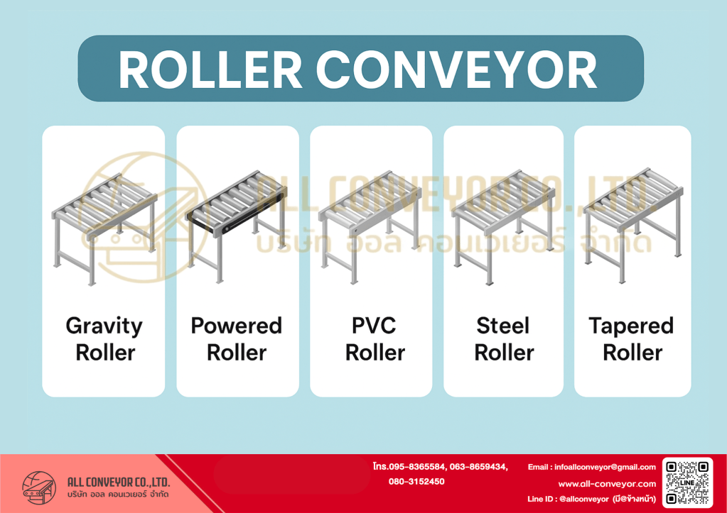 | Powered Roller (Belt Driven) | มีมอเตอร์ | เหล็ก / PVC | 50–100 กก. | ฿9,000–฿12,000 |
