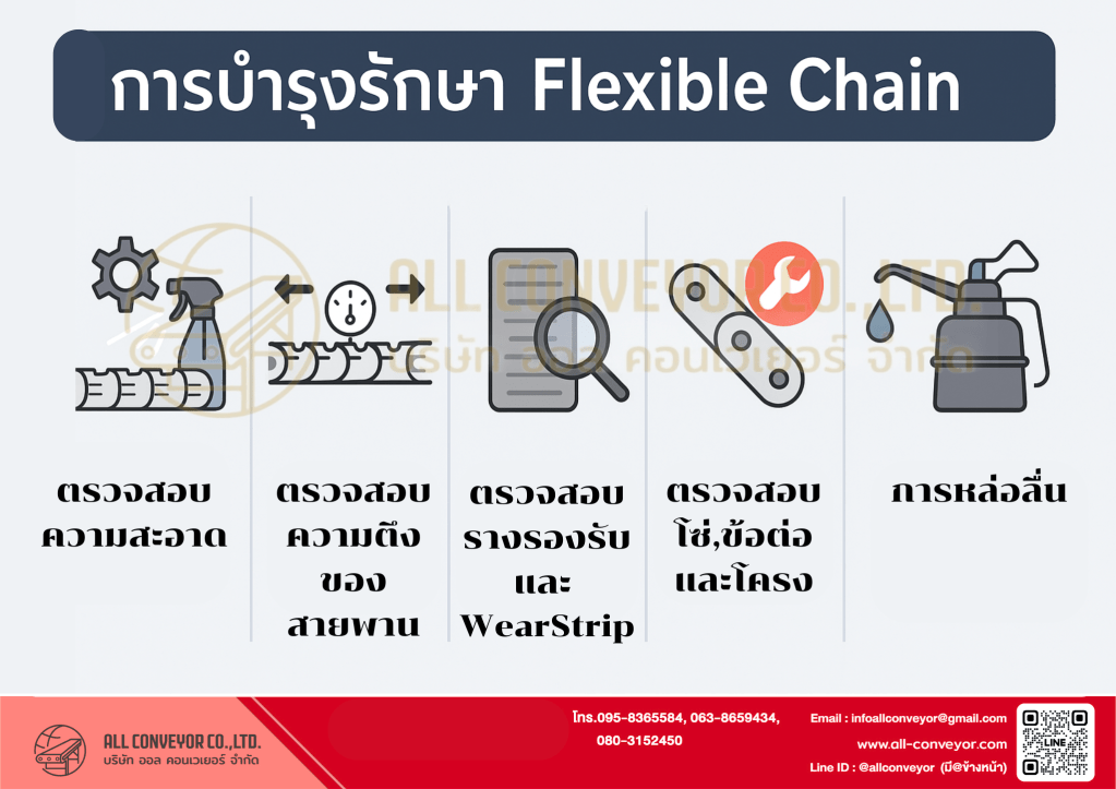 การบำรุงรักษาตามขั้นตอนเหล่านี้จะช่วยให้ Flexible Chain ทำงานได้นานขึ้น ลดค่าใช้จ่ายซ่อมบำรุง และป้องกัน Downtime ของสายการผลิต