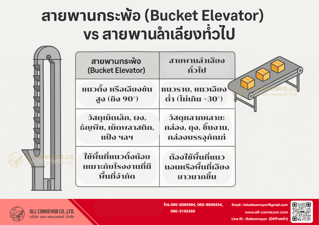 | สายพานกระพ้อ (Bucket Elevator) | แนวตั้ง หรือเอียงชันสูง (ถึง 90°) |