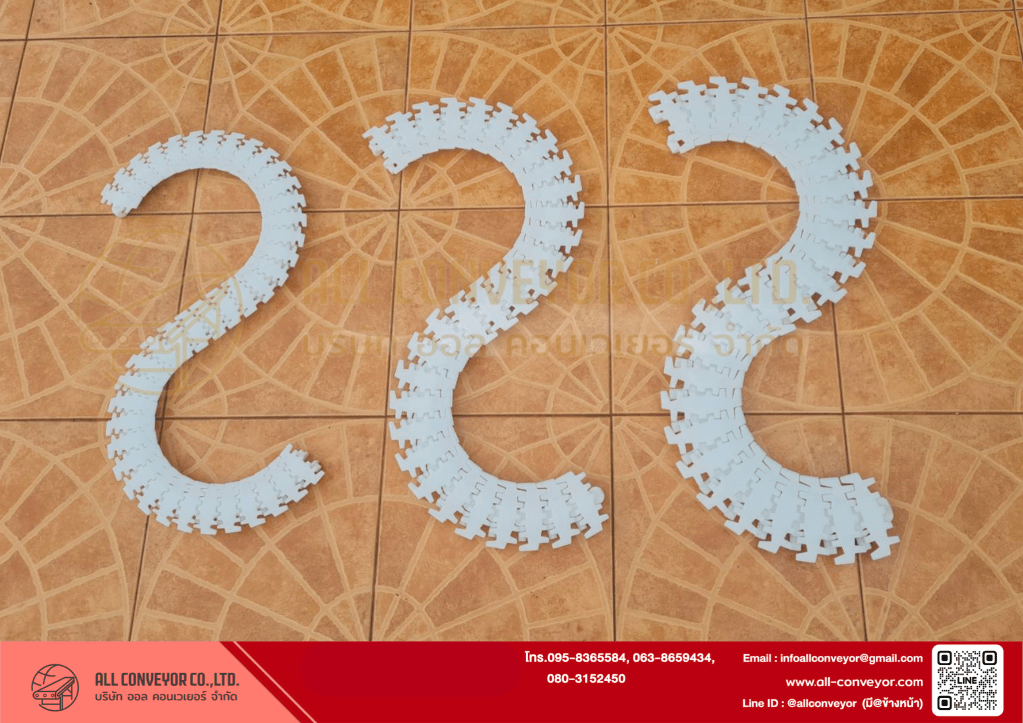 - Flexible Chain พลาสติก POM อาจมีรัศมีโค้งขั้นต่ำ 150–200 มม.