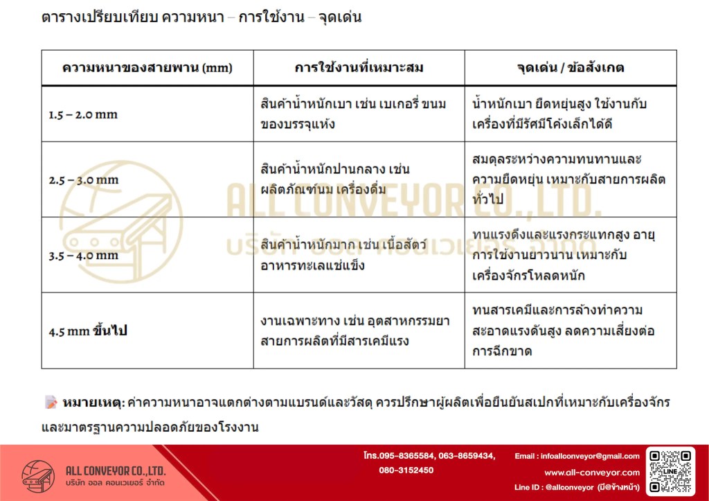 - พื้นที่ล้างบ่อย ใช้สารเคมีแรง → เลือกสายพานหนา ทนการกัดกร่อน