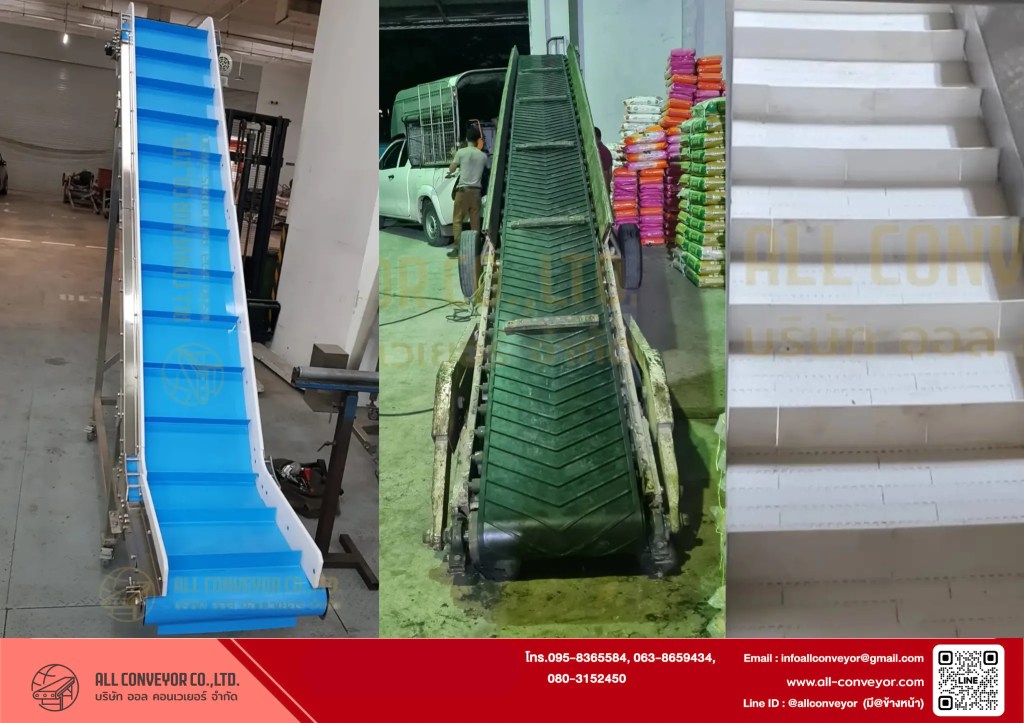 - สินค้าน้ำหนักมาก → ใช้ Rubber Belt หรือ Roller Conveyor แบบ Incline